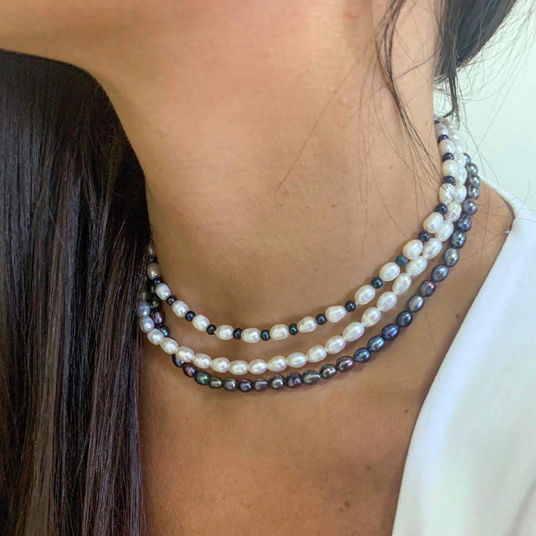 סט פנינים של אורז לבן בשילוב פנינים עגולות בצבע שחור, קטנות ועדינות .